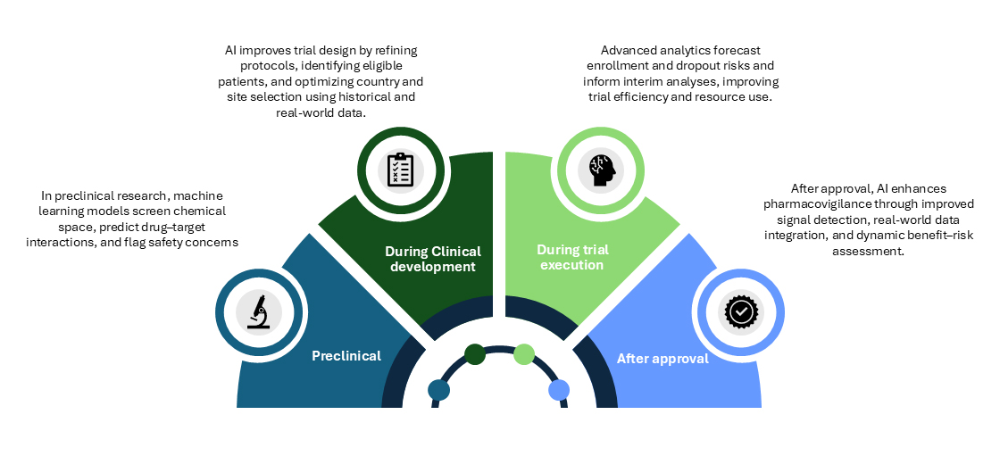 - Post-approval: Strengthens pharmacovigilance through improved signal detection, real-world data integration, and dynamic benefit–risk assessment.
